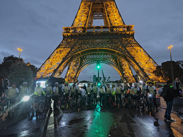 We fought our way down through the throngs of tourists to the base of the tower where we met up with Louise and Madeline, and all the other groups who'd now made it from the Arc De Triomphe - only Colin's group were missing. It was quite an emotional moment for everyone realising we'd all reached our destination with the help of our teams and the support team. Louise and Madeline hit the spot handing out cups of prosecco which everyone really appreciated. Being dark now it wasn't easy to get a photo of the whole group. Still no sign of Colin's group - I'd had a call to say they'd had more punctures but they were still aiming to get to the Tower.