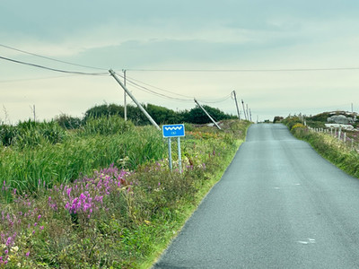 We had a stop at Claddaghduff beach where it was possible to drive across the sand to Omey Island. Colin drove Lo11y onto the beach but the tide wasn't out enough to get right across. Driving away from there we saw some leaning electricity posts - we're not sure if it was the wind that had caused this or the guys installing them had been on the Guinness.
