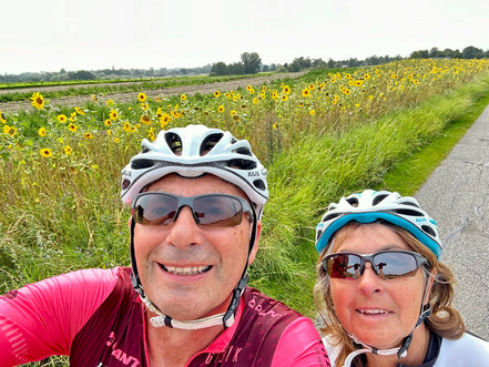 The following day we did a 43 mile bike ride which took us along quiet country lanes, then to some coastal towns. We stopped for a coffee and cake at a kite surfing beach. The beaches have lovely soft white sand along the north coast – shame the waters so flipping cold. The route took us back along the side of the lake where there were beautiful wild flowers growing on the roadside, and there was a large patch of sunflowers near our camping farm which took us back to our time in France last summer.
