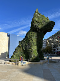 It was very dark, wet and overcast as we disembarked the ferry, and we headed straight to the Camping Aire (a municipal camping area) that sat high above the city with terrific views. As this afternoon was showing dry fine weather, with heavy rain forecast the next few days, we decided we needed to get as much outside sightseeing in as possible. A bus took us down into the old town (Casco Viejo) where we visited the Mercado de La Ribera (an indoor food market and food hall), had a walk around the streets of the Casco Viejo admiring the architecture, then after dipping into the commercial shopping area to buy SIM cards, we walked along the waterfront to the Guggenheim Museum – a striking metal structure housing contemporary art exhibitions. There are some famous monuments around it – a giant bronze spider and an enormous Puppy that’s made up of colourful flowers. After a walk through a park we headed back into the Casco Viejo for a glass of vino in a nice square, then continued to the commercial centre where we’d spotted some lively pintxos bars earlier. Pintxos are the Basque equivalent of tapas – small snacks of meat, seafood, olives and peppers to name a few ingredients. We managed to get a table inside a buzzy bar and tucked into delicious octopus, anchovies and other picky bits. We loved watching the groups of locals and presumably work colleagues enjoying a few drinks and tasty food without going over the top as us Brits tend to do.